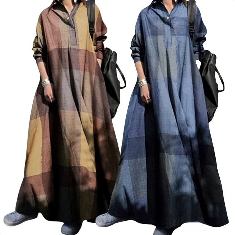 Muslim Women Long A-line Dress Lapel Neck Pocketed Mid East Shirt Dress Spring Summer Lady Printed Cotton Linen Loose Dress